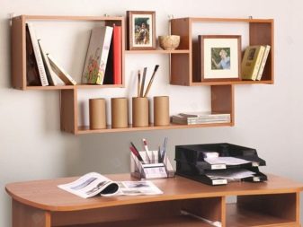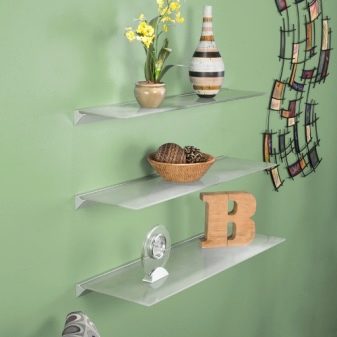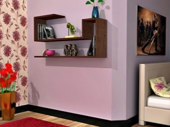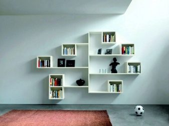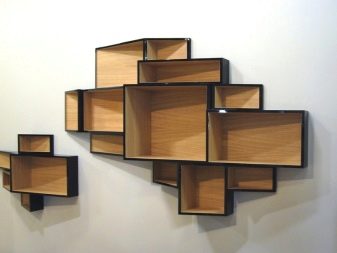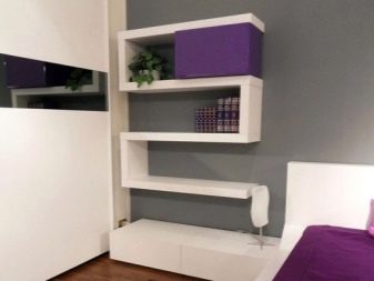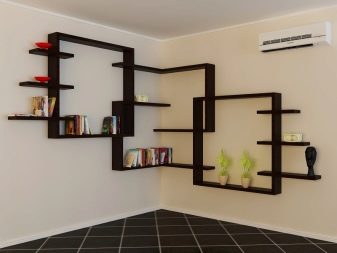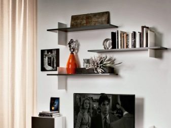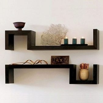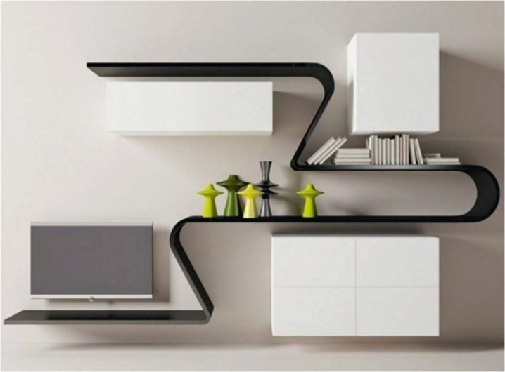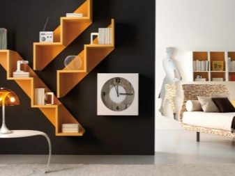 العناصر المعلقة على الرفوف مناسبة في الأنماط آرت ديكو وفن البوب. يمكن وضع مثل هذه التصاميم على الأثاث. يتم ضبط نغمة التكوين بالكامل بواسطة رف ثقيل ممدود على حافة السقف ، والذي يتحول بسلاسة إلى أجزاء مع عدد كبير من الطبقات..