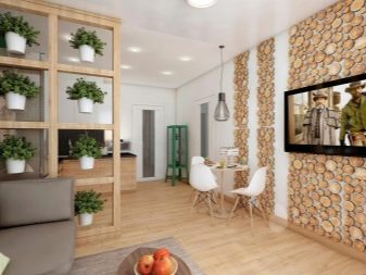 - Ecostyle يمكن أن يعزى إلى جاذبية المواد الطبيعية. زخرفة الجدار مع الرقائق الخشبية ، والأثاث الخشبي الطبيعي ، والديكور مع عوارض السقف ، والجدران البيئية ، وحتى أكثر من ذلك ، سيكون الديكور المنسي منذ فترة طويلة مع النباتات مناسبًا. تبدو الأشجار في الأواني الكبيرة جيدة بشكل خاص..