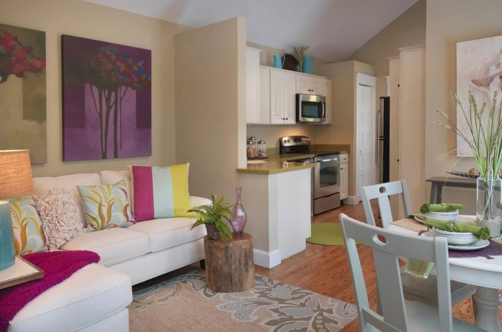 - المطبخ غرفة المعيشة. الحل الصحيح لتلك الحالات التي تكون فيها إعادة التطوير مستحيلة.