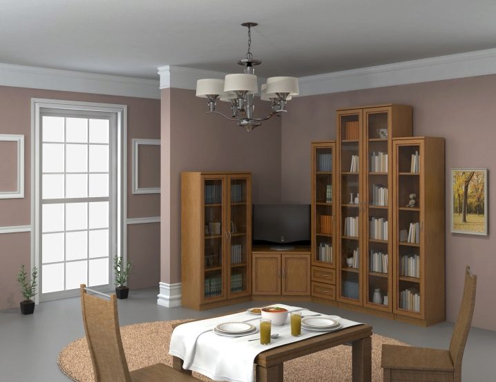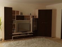 - خزانة الملابس الزاوية هي الخيار الأفضل لغرفة المعيشة الصغيرة. يقع هذا النموذج في الزاوية. هذه الخزانة مدمجة ، يمكنها توفير مساحة الغرفة بشكل كبير. يقع مكان التلفزيون على الجانب الأوسع ، وهناك أيضًا أرفف ومقصورات إضافية لأشياء أخرى.