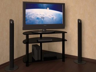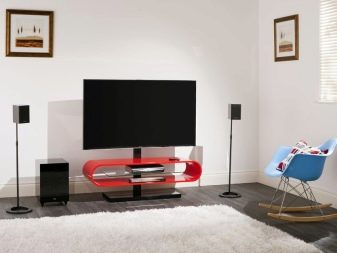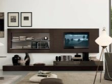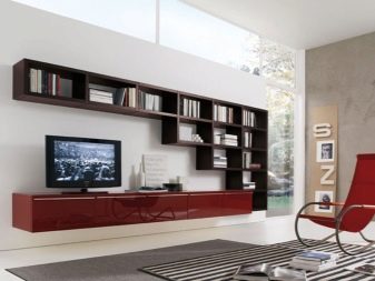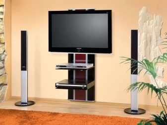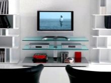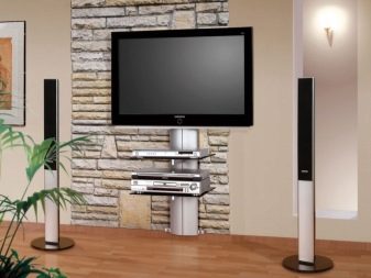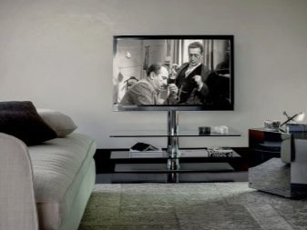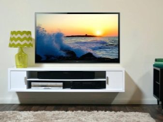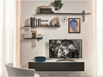في غرف المعيشة ذات المساحة الصغيرة ، من المهم استخدام رف لتركيب جهاز تلفزيون مثبت على جدار الغرفة. بالنظر إلى وزن التلفزيون ، يجب أن يكون هذا الجزء موثوقًا ودائمًا. يتم استخدام أنواع مختلفة من الخشب والزجاج عالي القوة والجدران الجافة في إنتاج الأرفف..