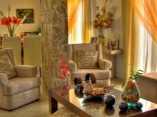 تبدو الألوان الوردي الفاتح والأصفر الباهت والأخضر والزيتون والأزرق والرمادي رائعة ومملة في الداخل. على النقيض من ذلك ، يمكنك استخدام الأثاث والستائر بألوان غنية. ستضيف اللمسات اللونية الموضوعة بشكل صحيح الراحة والراحة إلى الداخل. سوف يتناسب الأثاث والمنسوجات اللامعة بشكل مثالي مع التصميم الداخلي الرتيب.