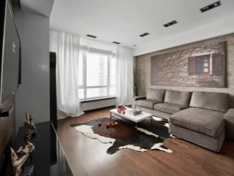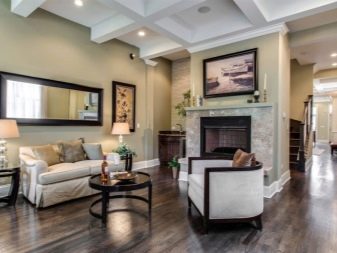 من الأفضل استخدام الأرضية المظلمة في غرفة المعيشة الكبيرة في منزل ريفي. وفي شقة صغيرة ، اختر أرضية فاتحة بنمط من الخشب الطبيعي.