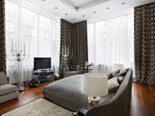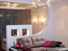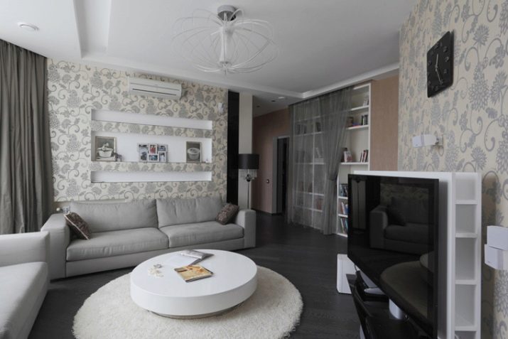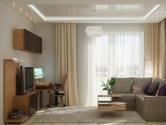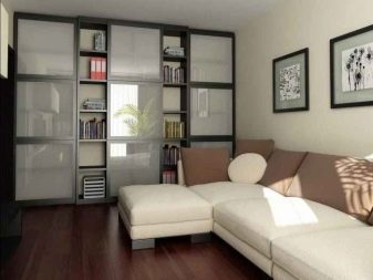 في حالة الجمع بين غرفة المعيشة وغرفة النوم ، يمكنك استخدام قسم بسيط من اللوح الجصي. وإذا كان تخطيط الغرفة يحتوي على غرفة إضافية على شكل مكانة ، فيمكنك تسييج منطقة النوم باستخدام أبواب أو ستائر منزلقة..