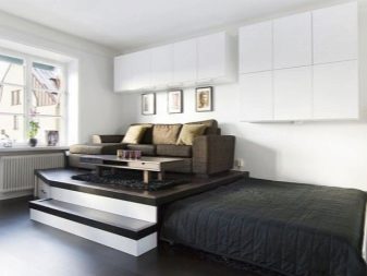 في بعض الشقق يمكن رفع الأرضية بضعة سنتيمترات لنقل منطقة منفصلة إلى المنصة وبالتالي فصلها عن باقي الغرفة. ولكن ، كقاعدة عامة ، في غرفة مربعة ، من الضروري ، على العكس من ذلك ، توسيع المساحة بصريًا ، لأن الأسقف المنخفضة في الشقة تضغط على المساحة بشكل أكبر..