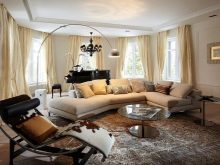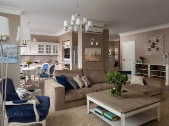 غالبًا في المخططات الحديثة ، تكون غرفة المعيشة عبارة عن غرفة للتجول. لا يمكن تسمية مثل هذه الشقة بأنها غير ناجحة ، لأن غرفة المرور ستحتجز الضيوف ولن تسمح بنظرات الضيوف الفضولية إلى غرفة النوم أو الدراسة..