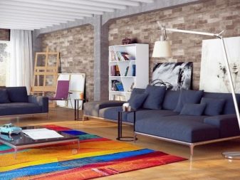 يتم الجمع بين مصباح أرضي باهظ وشكل غير عادي وأريكة زاوية مشرقة بشكل مثالي في داخل غرفة معيشة صغيرة. الظلال الجريئة المختارة لافتة للنظر ولكنها ليست ساحقة. الميزة الرئيسية لهذا التصميم الداخلي هي عدم التحميل الزائد بقطع مختلفة من الأثاث والديكور..