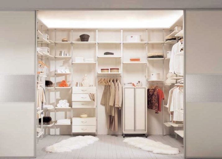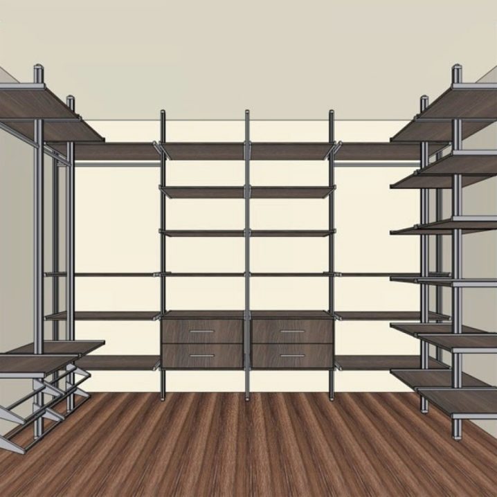 نظام خزانة الملابس على شكل إطار متصل برفوف معدنية خاصة. اصطدموا بالأرض أو بالسقف. بعد ذلك – الرفوف ، والأدراج المختلفة مشدودة. نظام تخزين الملابس سهل التجميع والنقل ، الرفوف متينة للغاية ، الهيكل يبدو بسيطًا من الخارج.