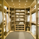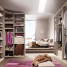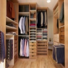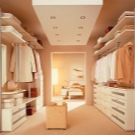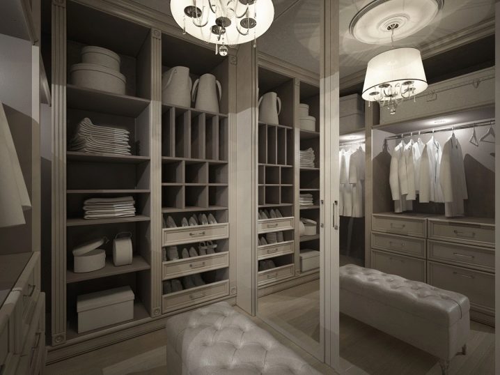 أبسط تصميم هو وضع الرفوف على طول الجدران ، كما هو الحال في الخزانة. لكي تكون الغرفة عملية للغاية وعملية ، يجب أن تكون متوسطة الحجم على الأقل. ضع في اعتبارك أنك على الأرجح ستغير ملابسك في مثل هذه الغرفة ، وستحتاج أيضًا إلى وضع مرآة وكرسي..