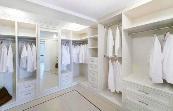 أهم عنصر في غرفة خزانة الملابس هو المرآة. لتوفير المساحة ، يمكن ربطه بالباب من الداخل. أرفف للأحذية والقبعات والرفوف والأدراج الصغيرة والكبيرة – تملأ هذه العناصر غرفة كاملة. يتم إرفاق شريط خاص لتخزين العناصر الطويلة. يتم إنشاء مقصورات صغيرة للأشياء الصغيرة.