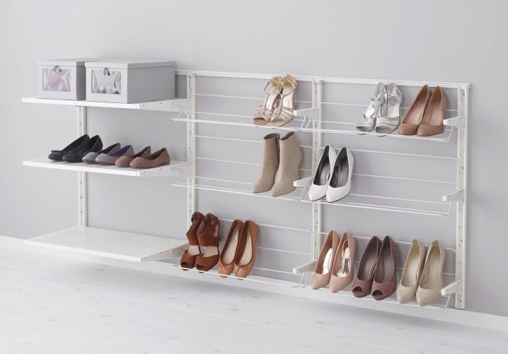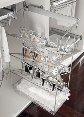 بالإضافة إلى الخزائن الخاصة ، هناك العديد من الأدوات التي يمكن أن تبسط إلى حد كبير تنظيم تخزين خزانة الملابس. هناك العديد من تجهيزات الخزانة: أنظمة سحب ، حاملات منزلقة ، سلال ، أنظمة رفيعة ، صناديق وغير ذلك الكثير. هدفهم الرئيسي هو تبسيط البحث عن الزوج الضروري ، بحيث تحتفظ الأحذية الموسمية بجميع خصائصها..