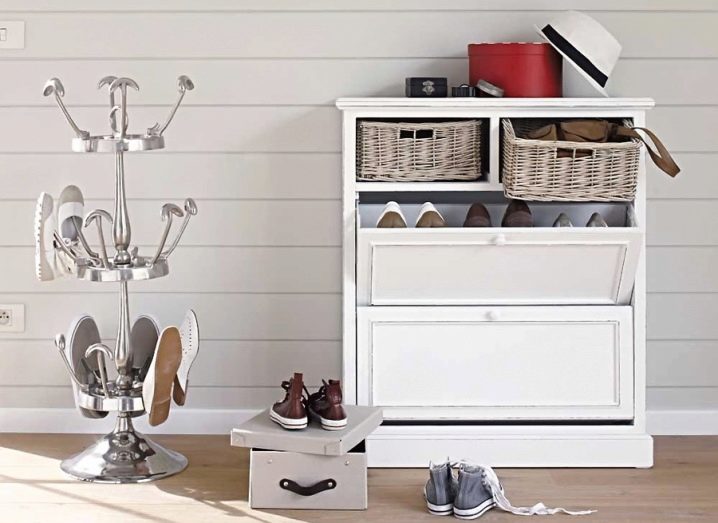 - خزانة. هناك مجموعة كبيرة ومتنوعة من خزائن الملابس. هناك نماذج متخصصة للأحذية. تختلف التصميمات حسب نوع الحذاء. قبل التخزين على المدى الطويل ، من الضروري إزالة الغبار والأوساخ من زوج من الأحذية ، وكذلك المعالجة بمطهر ومضاد للكهرباء الساكنة..