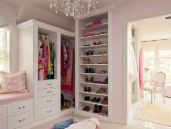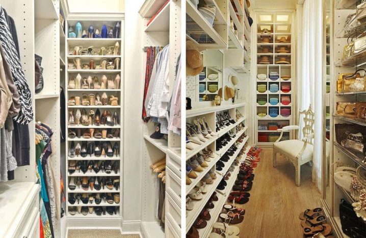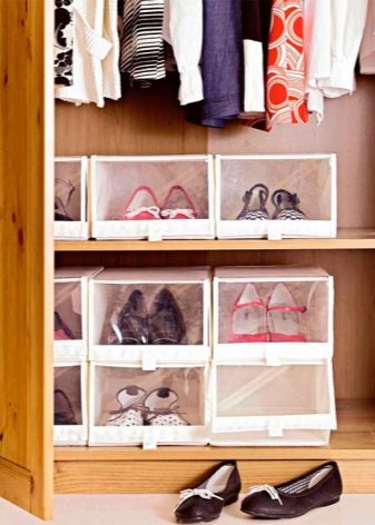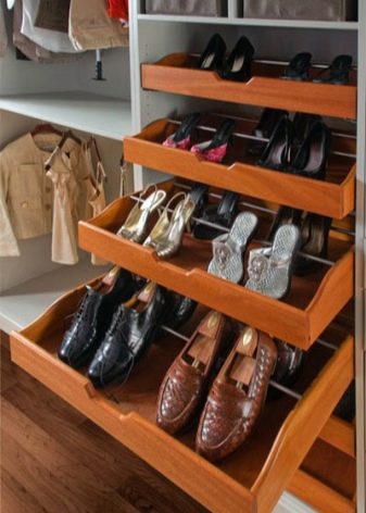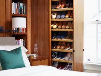 عادة لا تحتوي الشقق الصغيرة على غرفة لارتداء الملابس. وغرفة النوم مجهزة بخزانة ملابس واسعة. في المساحة الداخلية ، يمكنك وضع أرفف في خزانة أحذية. لسهولة التخزين ، يجب أن تكون الأدراج في خزانة الملابس خاصة. يمكن للأرفف المائلة الموجودة على الرف القابل للسحب في غرفة النوم استيعاب الأحذية الموسمية لجميع أفراد الأسرة. للتخزين الدقيق ، يتم استخدام ملحق في الرف ، يتم وضع الحذاء عليه. يجب أن تكون أرفف تخزين الأحذية الطويلة مرتفعة الارتفاع. الحامل المثبت داخل الصندوق ينظم بشكل جيد وضع الأحذية. أدراج من النوع المفتوح مع مقسم تجعل من السهل الاحتفاظ بالأحذية وتخزينها في الخزانة.