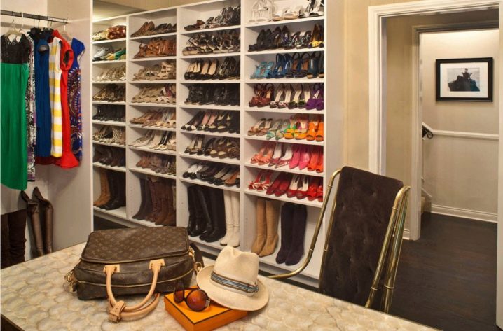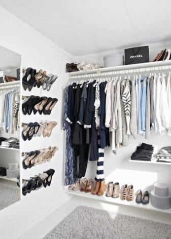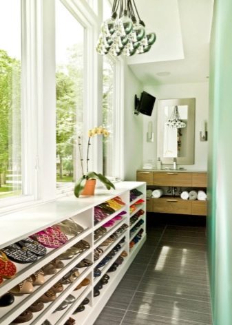 إذا كانت الشقة تحتوي على غرفة ملابس ، فسيكون من المثالي تجهيزها لاستيعاب أنظمة تخزين الأحذية. صحيح ، ليس كل شخص لديه غرفة إضافية كغرفة لارتداء الملابس ، لذلك يمكنك التفكير في خيارات لترتيبها. قد يكون المخزن مناسبًا لذلك ، بالإضافة إلى خزانة ملابس واسعة. يجب تنظيف هذه المساحة وتجهيزها بأرفف وتزيينها. يمكنك إخفاء الأزواج الموسمية هنا.