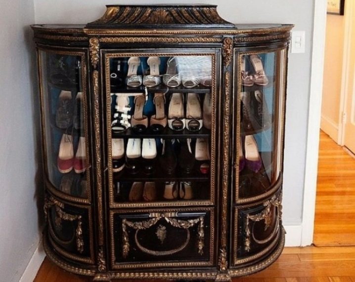 - خزانة الملابس العتيقة. يمكن أن يكون تخزين الأحذية الجميلة شيئًا فنيًا أصليًا إذا كنت تستخدم ، على سبيل المثال ، خزانة أطباق عتيقة أو رف زجاجي. في الجزء السفلي المغلق ، يمكنك وضع تشكيلة موسمية وأحذية قديمة قبيحة ، وفي واجهات العرض الزجاجية يمكنك وضع الأحذية الأكثر أناقة وجاذبية. سوف يجذب الانتباه وسيكون ملحقًا زخرفيًا رائعًا..
