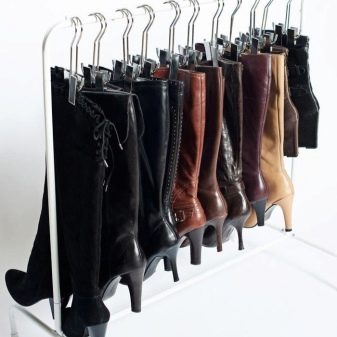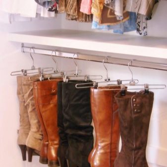 - شماعات للأحذية. توجد أجهزة خاصة لتخزين موديلات الأحذية الطويلة والأحذية الطويلة الأخرى. يمكن تثبيت علاقة الصندوق الأصلية على الشرفة من داخل الخزانة وبالطبع يوجد ركن للجهاز في غرفة الملابس.