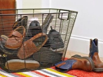 - سلال. يمكن استخدام السلال الكبيرة الأنيقة لاستيعاب النعال أو النعال أو الأحذية الأخرى التي لا تتطلب الاحتفاظ بالشكل. يمكن أن تكون من مواد مختلفة: مضفرة أو فولاذية. صُنعت بأسلوب معين ، وستصبح قطعة فنية مذهلة..