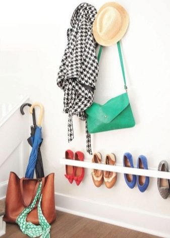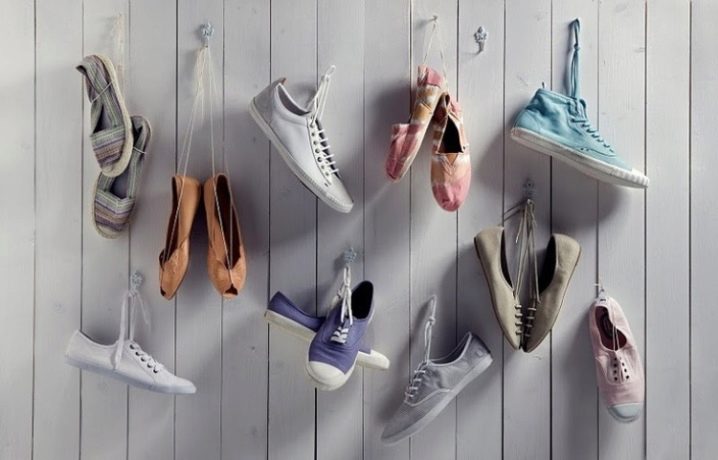 - الجدار مع الأحذية. يمكن تعليق أي أحذية أو أحذية رياضية أو أحذية رياضية على خطافات في الحائط باستخدام الأربطة المربوطة بأقواس.