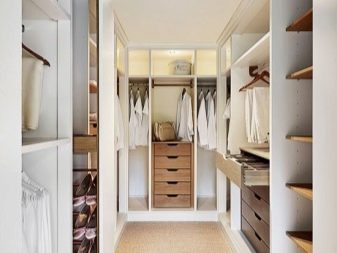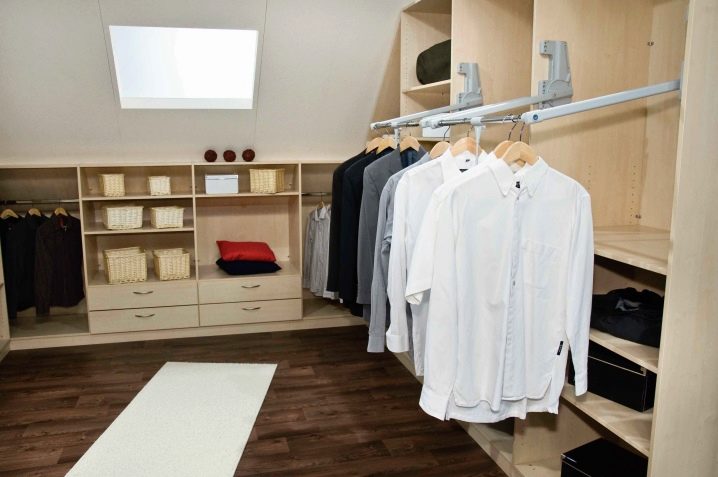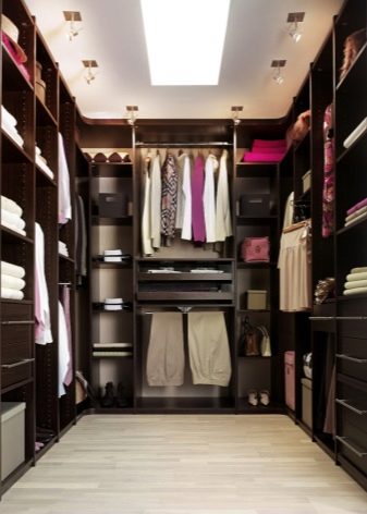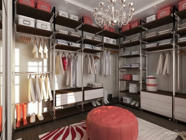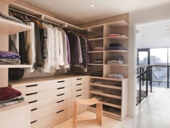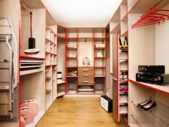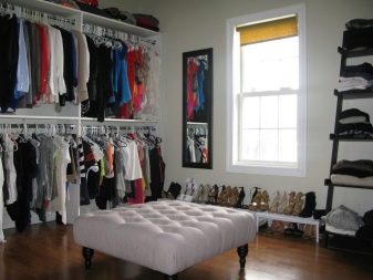 - لا يمكنك تخزين الملابس والأحذية فقط في غرفة ارتداء الملابس ، بل يمكنك إخفاء المعدات المنزلية هناك (حيث يتم إنشاء مقصورة إضافية في الغرفة).