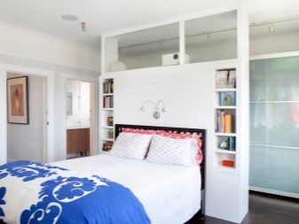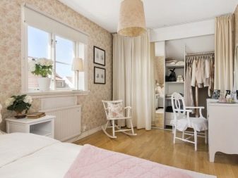 امنح غرفة ملابسك المستقبلية أحد الجدران (التي لا توجد عليها نافذة بالطبع). يمكنك اختيار مكان خلف السرير مباشرة أو على الجدار الجانبي المقابل ، ومن المهم أن يتم تسييج هذا الجزء بسهولة بنفس الأبواب أو الستائر..