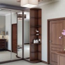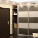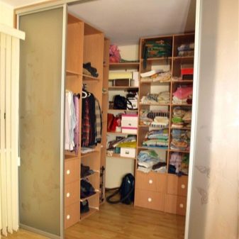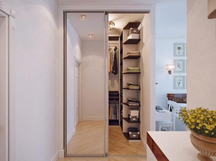 في ممر صغير ، توجد غرفة تبديل ملابس مقابل أكبر جدار. يتم تثبيت الأبواب المنزلقة من الأرض إلى السقف وعبر العرض بالكامل. هذا الخيار ناجح ، حتى لو كان الرواق ضيقًا وطويلًا. يتم تثبيت الأرفف والقضبان والخطافات ورفوف الأحذية والسلال والصناديق بالداخل. جوهر أي غرفة تبديل ملابس ، والأهم من ذلك ، غرفة ملابس صغيرة ، هو أنه لا يمكن أن يكون هناك مساحة غير مفيدة. تبدأ الأرفف من السقف نفسه – حيث يمكنك إخفاء الكثير من الأشياء التي لا تحتاجها طوال الوقت. للراحة ، سوف تحتاج إلى شراء حامل أو سلالم صغيرة.
