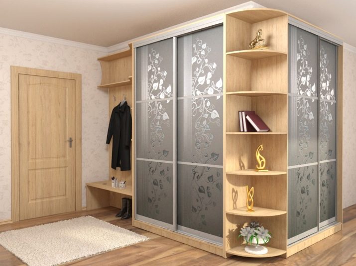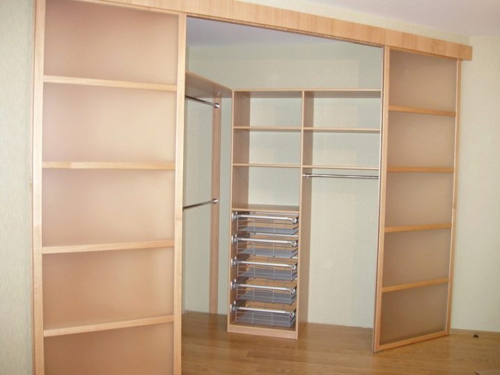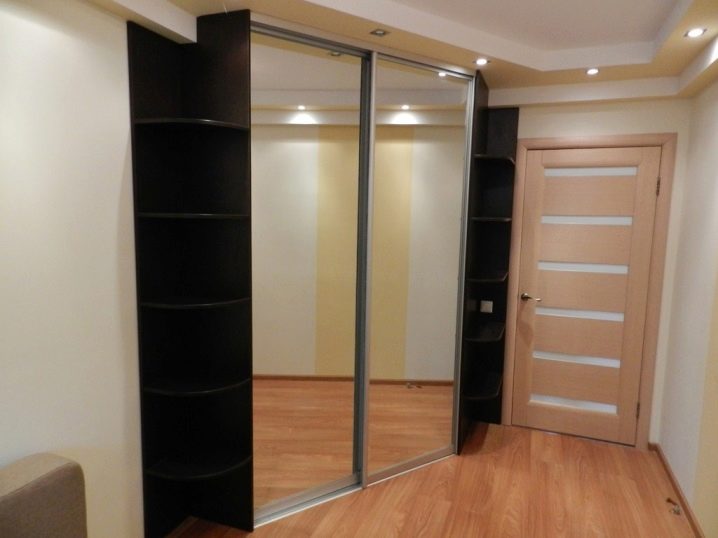 إذا لم تكن هناك مساحة كافية ، فيجب الانتباه إلى خزانة الملابس الزاوية. يمكن أن تكون خزانة ملابس زاوية أو رف مع أرفف مغلقة جزئيًا. هناك مشاريع يتم فيها تسييج الزاوية ببساطة بجدار من الحوائط الجافة ، حيث يتم صنع الباب ، ويتم وضع أرفف التخزين بالداخل مباشرة على الجدران. اتضح خزانة ملابس مثلثة.