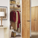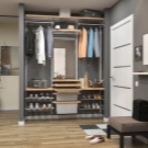 هناك خيارات لغرفة الملابس الصغيرة. هذا نظام تخزين صغير مفتوح للضروريات يقف عند الباب الأمامي. غالبًا ما يكون هذا رف أحذية ودرابزين للشماعات بملابس خارجية وخطافات للمظلات ورف علوي للقبعات والإكسسوارات..
