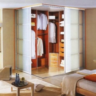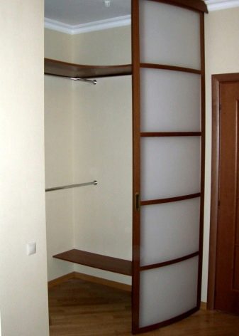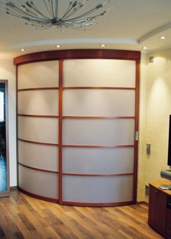 يمكن أن تتحرك أنظمة الأبواب المنزلقة ليس فقط على طول مسار مستقيم ، ولكن أيضًا على طول مسار منحني. عادةً ما يتم تثبيت الأبواب الشعاعية في غرف فسيحة ، لأن تصميمها لن يسمح لك بتوفير الكثير من المساحة القابلة للاستخدام. لكن البعض يقرر استخدامها في شقق صغيرة ، إذا كان مطلوبًا أن تتناسب الخطوط المنحنية للقسم في غرفة الملابس مع تصميم مماثل للغرفة..