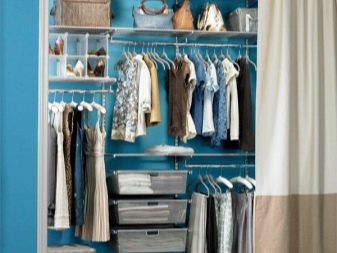 بالإضافة إلى الأبواب ، يمكن تركيب الستائر لعزل غرفة الملابس.. أبسط خيار هو اللوحات القماشية المعلقة من الكورنيش. إنها سهلة التركيب ، ويمكن مسحها بسرعة إذا لزم الأمر ، وسيكون لها مظهر أنيق وخفيف. تكلفتها أقل من تكلفة أي نوع من الأبواب..