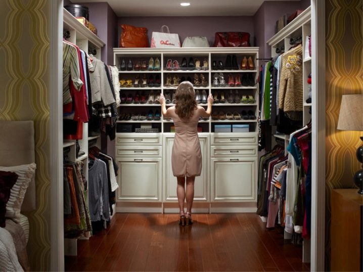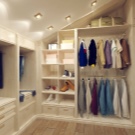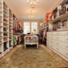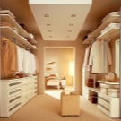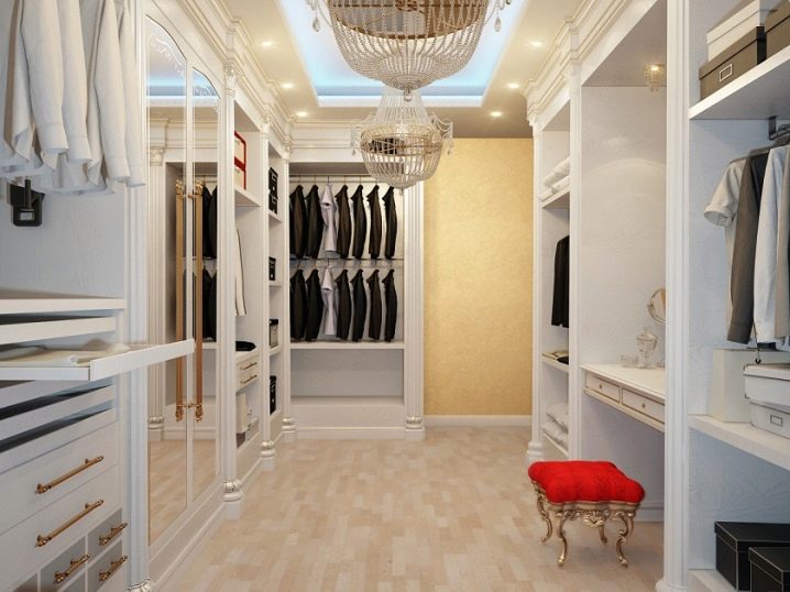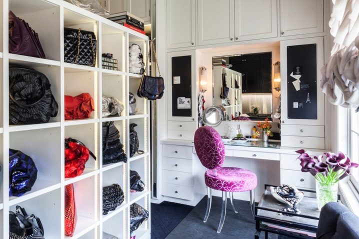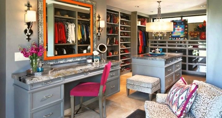 يختار الجميع أسلوب غرفة الملابس بشكل مستقل. تلعب التفضيلات الشخصية هنا دورًا كبيرًا ، ما هو ممتع لهذا الشخص أو ذاك. قد تحتوي الغرفة حتى على طاولة كي واحدة وعدة أرفف. إذا كانت الغرفة كبيرة ، فيمكنك تنظيم المساحة بحيث يكون هناك ركن للاسترخاء. هذا ينطبق بشكل خاص على الممثلات اللائي سئمن من الأعمال المنزلية ويحتاجن فقط إلى مكان للعزلة..