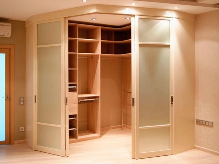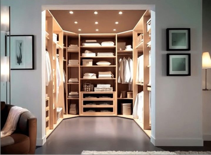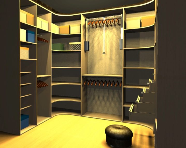 مفتاح النجاح عند التخطيط لغرفة تبديل الملابس في الزاوية هو قياس اللقطات المطلوبة. الميزة الكبيرة لمثل هذه المساحة هي اكتنازها. للتخطيط لمثل هذا المكان للأشياء ، يكفي في بعض الأحيان حوالي متر ونصف المتر المربع..