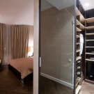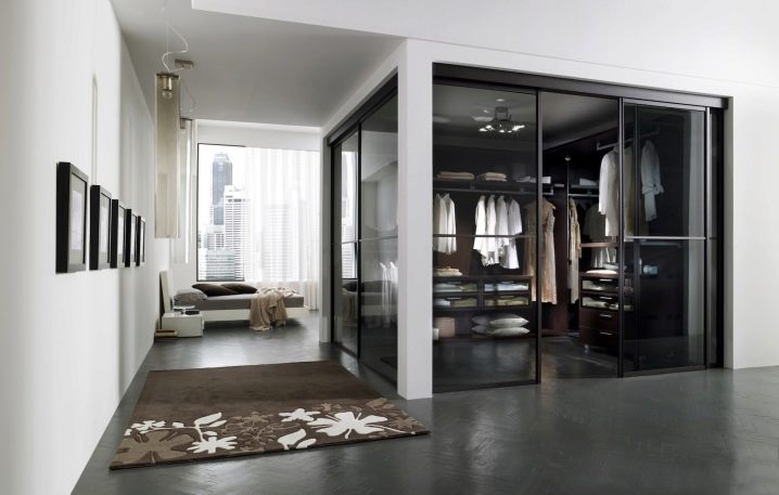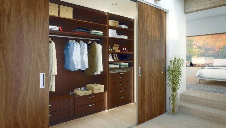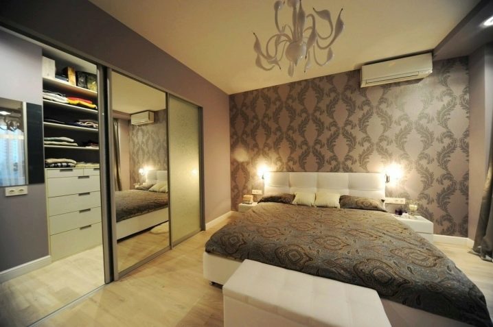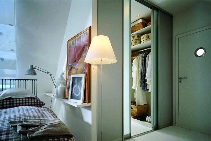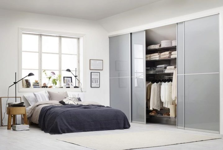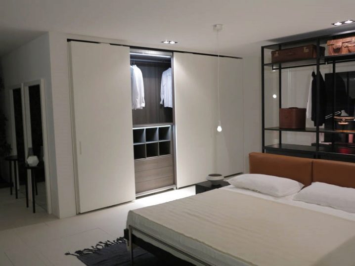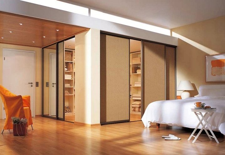 الخيار الأكثر حداثة وشعبية هو الأبواب المنزلقة. إنها جيدة لأنها سهلة الفتح. بجانب غرفة الملابس ، يمكنك وضع سرير أو طاولة أو طاولة بجانب السرير ، دون خوف من أنه عند فتح الباب ، سوف يلامس باستمرار الأثاث الموجود في غرفة النوم.