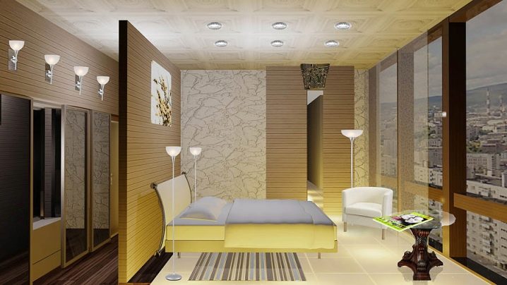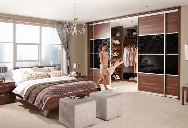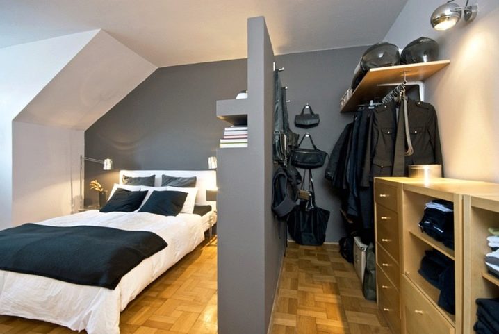 الخيار الأكثر شيوعًا هو غرفة تبديل الملابس مع غرفة نوم. هذا ينطبق بشكل خاص على الغرف الكبيرة بما يكفي. تبلغ المساحة القياسية لغرفة ارتداء الملابس هذه ثلاثة أو أربعة أمتار. وبسبب حقيقة أنه مدمج مع قاعدة الغرفة ، لا تضيع المساحة.