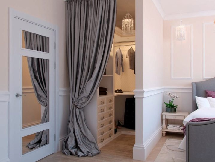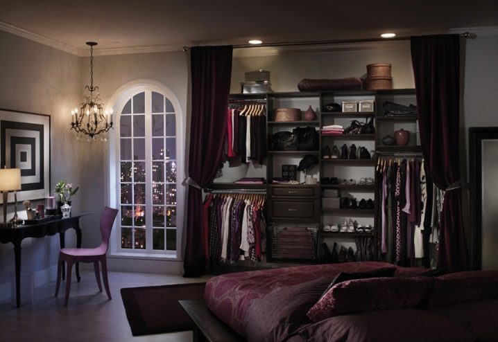 إذا كانت غرفتك مصممة بأسلوب كلاسيكي ، فيمكن استكمالها بغرفة تبديل ملابس موجودة في مكان مناسب. سيكون الخشب الداكن والستائر الطويلة الناعمة مناسبين هنا ، والتي ، إذا لزم الأمر ، ستخفي غرفة ارتداء الملابس الخاصة بك. ستائر أرجوانية تتناسب مع نغمة الغرفة في ظل أرجواني تبدو متناغمة للغاية.