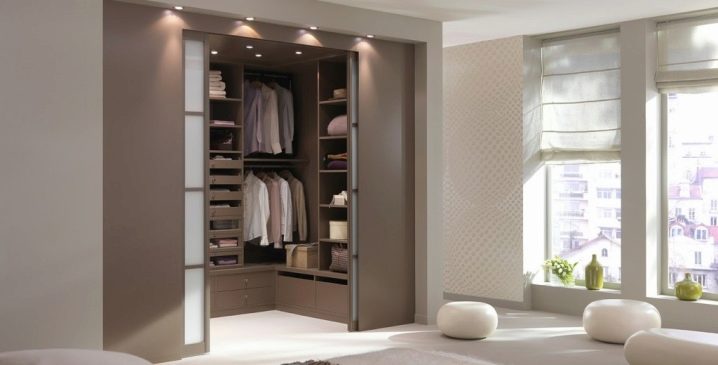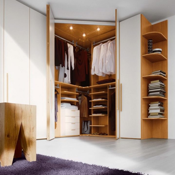 خيار شائع آخر هو خزانة ملابس الزاوية. إنه جيد لأنه لا يشغل مساحة كبيرة. عندما تكون غرفة الملابس في الزاوية ، يمكنك وضع منضدة الزينة أو السرير بجانبها.