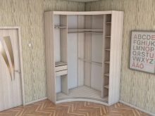 يمكن ملء هياكل الزاوية بعناصر مختلفة ، كل هذا يتوقف على حجم وشكل الهيكل. في الوقت نفسه ، يلعب نصف قطر الانحناء دورًا كبيرًا في نماذج الأثاث هذه ، لأنه يحد بشكل كبير من ملء الخزانة بالداخل.