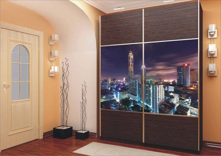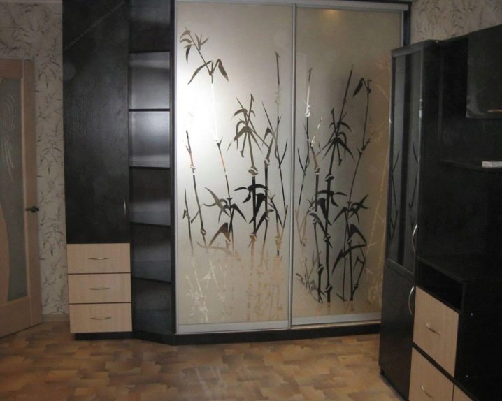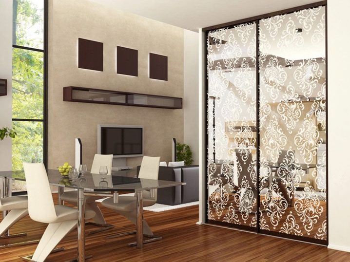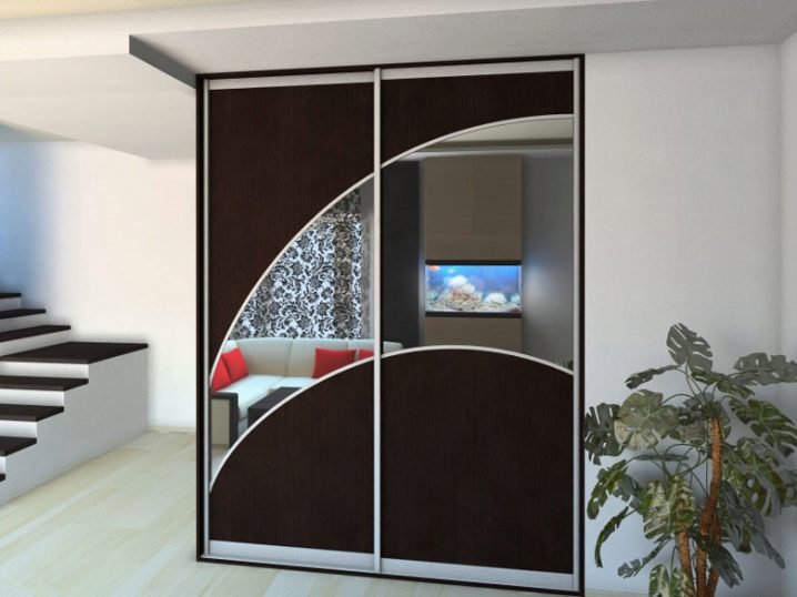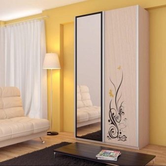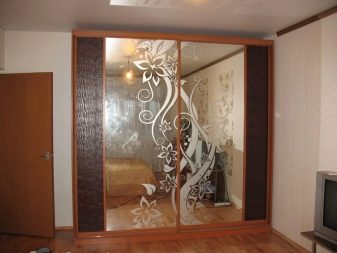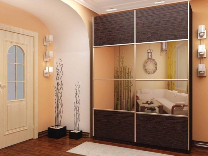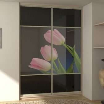إذا كنت خاليًا من الأحكام المسبقة وتعتقد أنه لا يوجد شيء يمكن أن يؤذيك ، فلا تتردد في اختيار واجهة خزانة معكوسة. أفضل خيار لتزيين الجزء الأمامي من خزانة الملابس هو استخدام مرآة مع تفاصيل من مواد أخرى. اللوح الرقائقي ، والزجاج المصنفر أو الشفاف ، والجلود وبدائلها ، والخيزران ، والألمنيوم ، والفولاذ المقاوم للصدأ وغيرها من المواد مناسبة هنا..