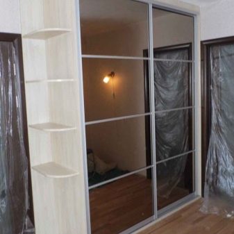 تتميز الواجهات التي تستخدم مرآتين على كل باب مع عناصر زخرفية أخرى بجمال وأصالة خاصة. خزانة الملابس المنزلقة مع المرايا توسع حدود الغرفة ، وتزيد من قيمة الضوء في الغرفة.