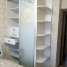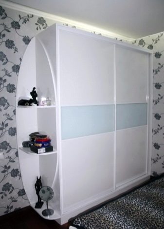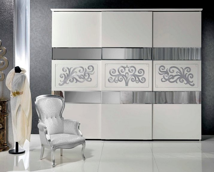 يتم إعطاء الأناقة الخاصة والنبلاء للداخل من خلال خزانة ملابس بيضاء ذات جوانب على شكل بلاط مع معينات ونقش ماسي. الوجه عبارة عن شطبة مزخرفة حول الحافة أو فوق سطح المرآة أو الزجاج بالكامل. يمكن أن يكون الشطبة إما متساوية أو أي شكل غير منتظم. في معظم الحالات ، يتم إجراء زخرفة الخزانات حسب الطلب. تكلفة هذه الخدمة ليست رخيصة ، ولكن النتيجة لن تسعدك أنت فحسب ، بل ستسعد أيضًا بالأصدقاء الذين يأتون للزيارة.