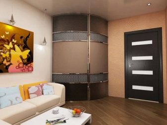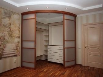 هذا الخيار له أبواب مقعرة في الداخل. بصريًا ، بهذه الطريقة ، تتسع المساحة ، ويتم تنعيم الزوايا. سيساعد ذلك في إعطاء الغرفة عمقًا إضافيًا. يمكنك اختيار الخيارات التي تتناسب تمامًا مع غرفتك ومفهومك.