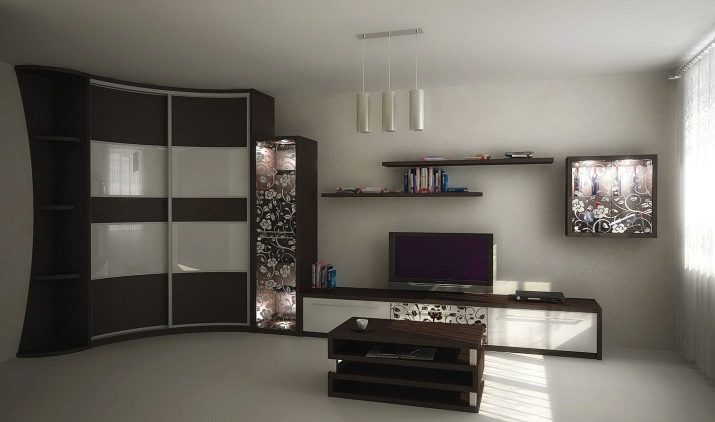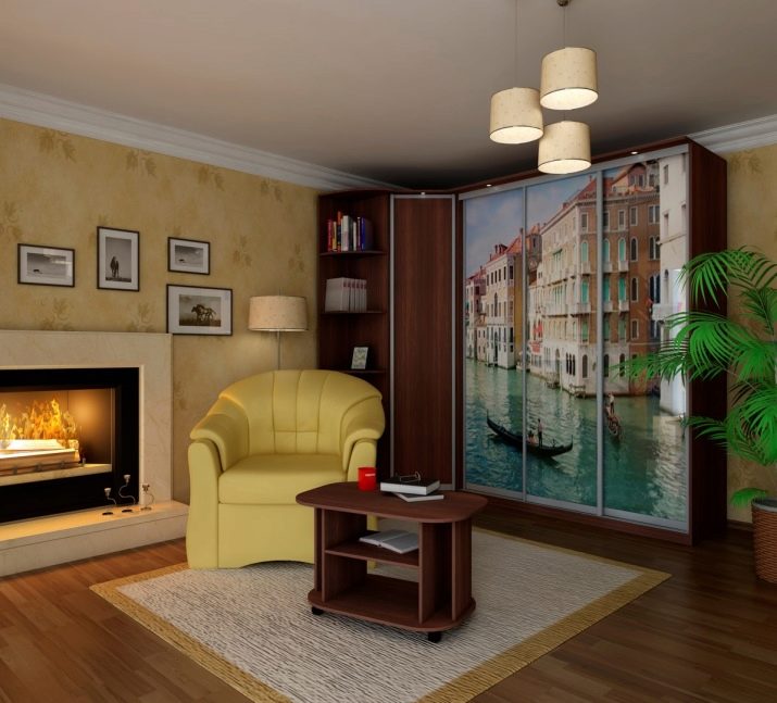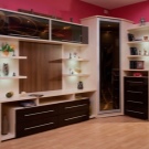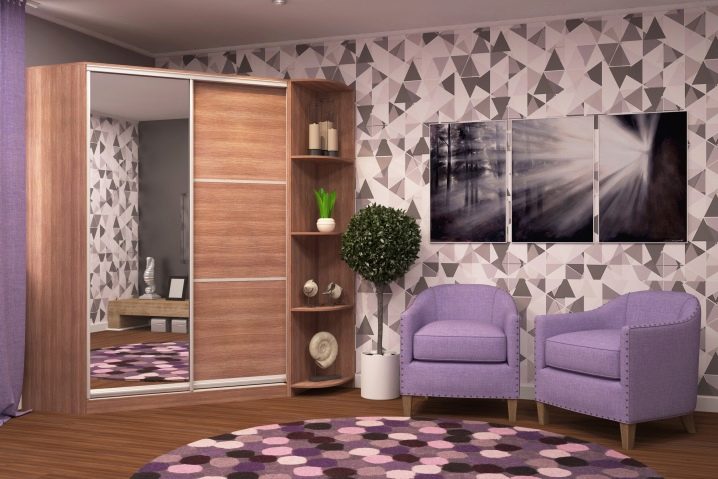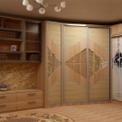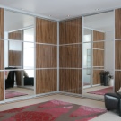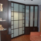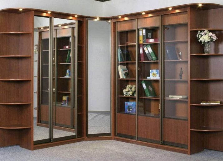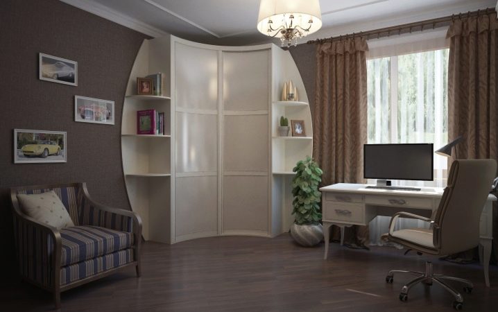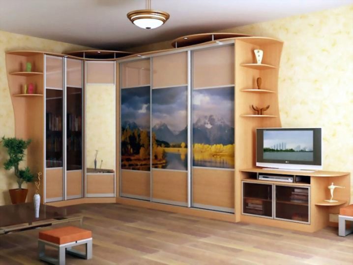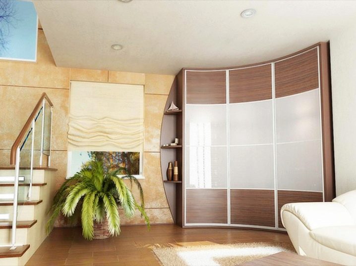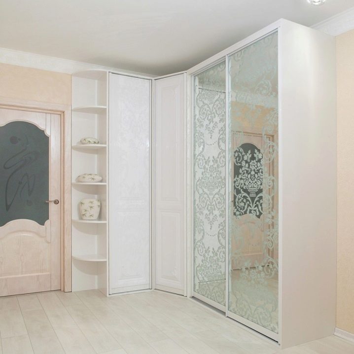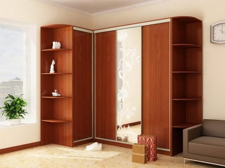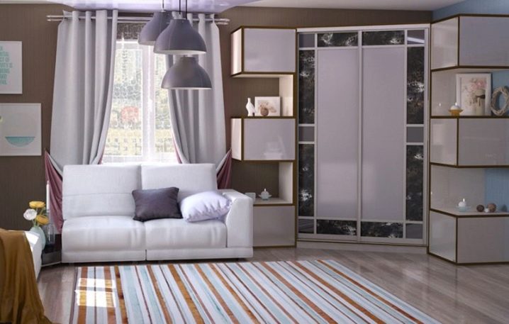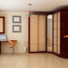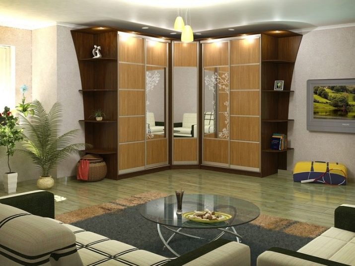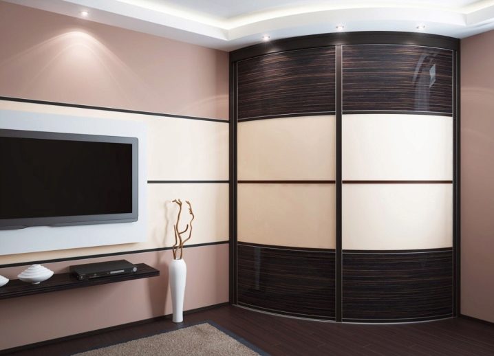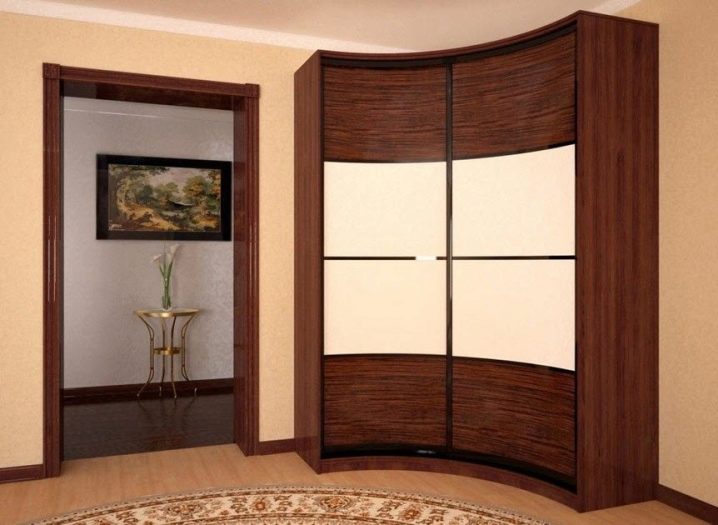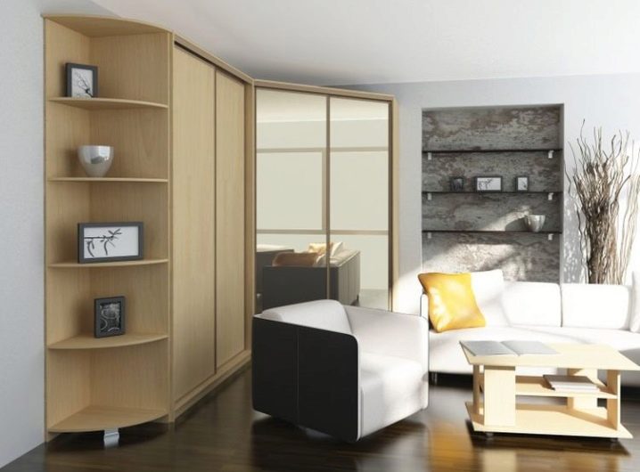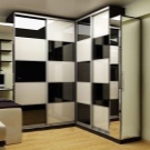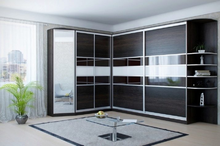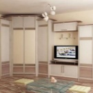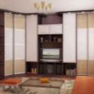 غالبًا ما يشغل النوع المدمج من خزانة الزاوية أحد الجدران بأكملها. عناصر السقف والجزء السفلي مفقودة. في جوهره ، هذا النموذج عبارة عن جدار بأبواب منزلقة ، أدلة منه متصلة مباشرة بأرضية وجدران وسقف الغرفة نفسها.
