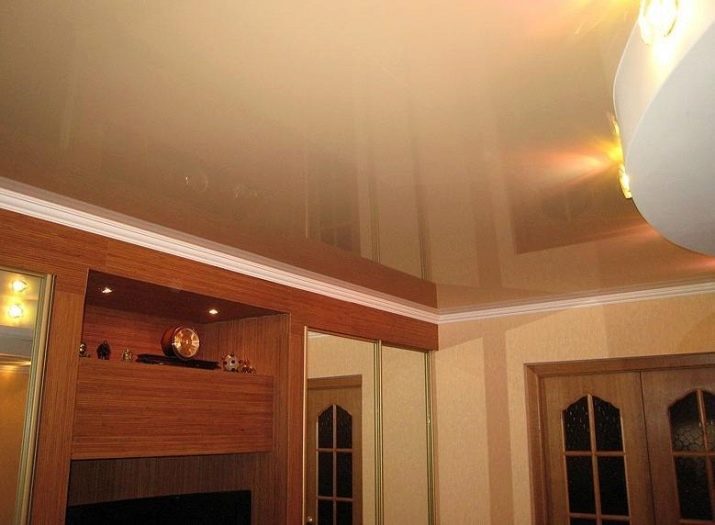 - السقف متصل بشريط زخرفي (لوحة زائفة) لخزانة الملابس. الطريقة سهلة التنفيذ وتبدو جذابة من الناحية الجمالية وتسمح لك بتفكيك السقف أو خزانة الملابس دون المساس ببعضها البعض. في هذه الحالة ، يتم تثبيت الأثاث مسبقًا للتثبيت اللاحق بلوحه الخاطئ للسقف الممتد.