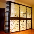 تم صنع خزانة الملابس من الحائط إلى الحائط قبل تركيب الأسقف. يوجد إضاءة في الشريط الزخرفي للخزانة.