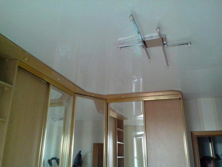 - تركيب سقوف متوترة مع خزانة ملابس موجودة. هنا يبدأ العمل ، كما في الحالة السابقة ، بتركيب عارضة خشبية على السقف. الفرق هو أنه يتم تثبيته أمام سكك خزانة الملابس المنزلقة. ستثبت العارضة أحد جوانب إطار السقف ، حيث سيتم شد اللوحة القماشية.