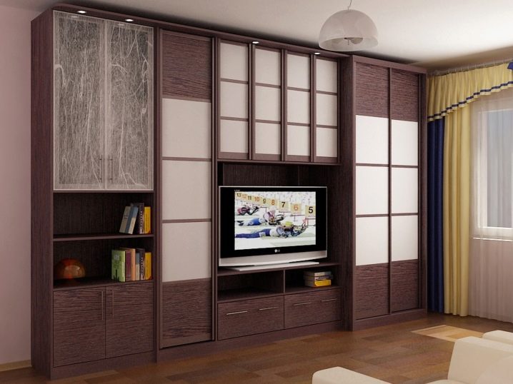 غالبا ما تسمى القاعة " القلب في المنزل", لذلك ، يجب التعامل مع تصميمه بمسؤولية ، مع مراعاة جميع الفروق الدقيقة ، بما في ذلك نمط الأثاث. تجدر الإشارة بشكل خاص إلى اختيار خزانة الملابس ، حيث إنها لن تكون فقط القطعة الرئيسية من الداخل ، ولكنها ستساعد أيضًا في إخفاء جميع الأشياء غير الضرورية عن أعين الضيوف. نظرًا لوجود تركيبات خاصة في الخزانة ، يمكنك بسهولة وضع كل ما تحتاجه على الرفوف والرفوف. في الأساس ، تم تصميم خزانة الملابس لتخزين المستندات ، والأجهزة المنزلية الصغيرة ، وبياضات الأسرة ، والأطباق ، والملابس. على الرفوف المفتوحة للخزانة ، يمكنك وضع الهدايا التذكارية والصور الفوتوغرافية والتلفزيون وكؤوس النبيذ واللوحات..