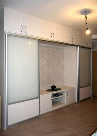 تتميز المساحة الصغيرة بتصميم داخلي بسيط ، أي أنه يجب إخفاء جميع الأشياء غير الضرورية عن أعين المتطفلين. لهذه الأغراض ، تم اختراع خزانة ملابس. خلف الواجهات المنزلقة ، يمكنك إخفاء مكانة باستخدام لوحة تلفزيون وخزانة بها كمبيوتر أو كمبيوتر محمول ومصادر أخرى للإشعاع. في هذه الحالة ، ستكون خزانة الملابس بمثابة دراسة أيضًا. تعمل هذه التقنية بشكل رائع في الغرف والاستوديوهات الفردية الصغيرة..