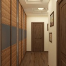 - خزانة ملابس خشبية في ممر ضيق (الشكل 7). قاعدة الهيكل مصنوعة من الخشب. تم اختيار مرآة واسعة في الوسط وألواح ضيقة أفقية داكنة على طول محيط خزانة الملابس بالكامل كديكور. يكتمل تصميم الممر الضيق بإضاءة سقف معكوسة وثلاث لوحات على الجانب المقابل ورفوف مفتوحة. جميعهم معًا يخلقون مجموعة عضوية وأنيقة لا تفسد المساحات الضيقة.