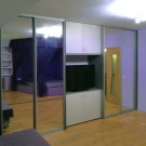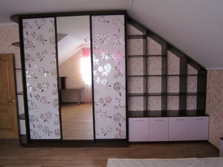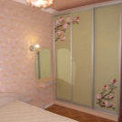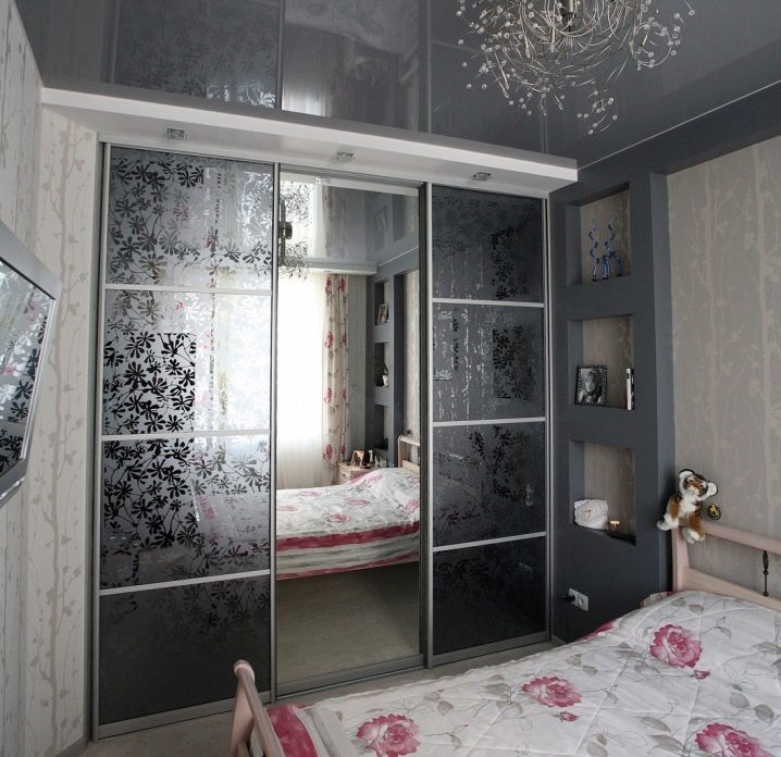 ومع ذلك ، يعتبر الكثيرون أن هذا النوع من اللمسات النهائية غير عملي للغاية ، لأن سطح المرآة يتسخ ويغطى بالغبار بسرعة كبيرة. إذا كنت ترغب في تقليل وقت التنظيف إلى الحد الأدنى ، فلا تجعل الجدار بأكمله معكوسًا ، بل بابًا واحدًا فقط. تبدو الخزانة ذات الزجاج المصنفر أيضًا مبهجة للغاية من الناحية الجمالية. من بين أشياء أخرى ، يمكن تغطية سطحه بأنماط أو لوحة أصلية..