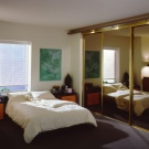 في الحالة الثانية ، يمكنك أن ترى كيف يتيح لك استخدام خزانة ملابس بباب عاكس بالكامل زيادة المساحة بصريًا بأكثر من مرتين. تتناسب خزانة الملابس هذه أيضًا بشكل عضوي مع التصميم البسيط ، لأنه إذا انعكست كمية كبيرة من القمامة في المرآة ، فستبدو الغرفة ببساطة غير مرتبة.