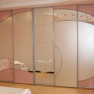 ستبدو خزانة الملابس المزينة بلوحة أو ملصق مثيرًا للاهتمام أيضًا. لإنشاء مثل هذه الصورة على سطح الزجاج ، غالبًا ما تستخدم تقنية السفع الرملي الشائعة. في عملية إنشاء مثل هذا النمط ، يتم تطبيق الهواء برمل الكوارتز على الخزانة. من أجل أن تكون الصورة واضحة وجميلة ، يتم استخدام الإستنسل.